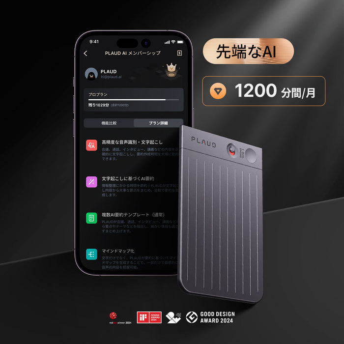 - 最新AIエンジン:GPT-5、Claude 4、Gemini 2.5 Pro などを組み合わせた「Plaud Intelligence」により、人間の会話のニュアンスや文脈を正確に再現。